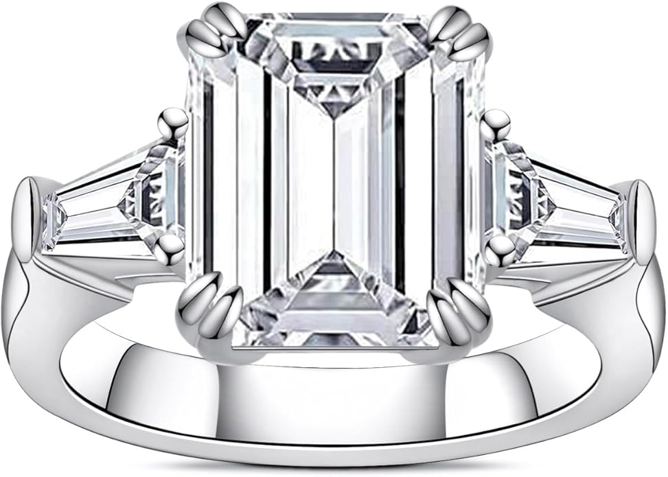 Bold and architectural, this striking three-stone ring features a commanding emerald-cut center stone flanked by tapered trapezoid side stones that accentuate its clean lines and symmetry. The elongated facets of the emerald cut create a hall-of-mirrors effect, offering depth and sophistication with every glance. Set in a sleek, high-polish white metal band, this design evokes timeless elegance with a modern edge — perfect for the woman who values confidence, clarity, and classic glamour.